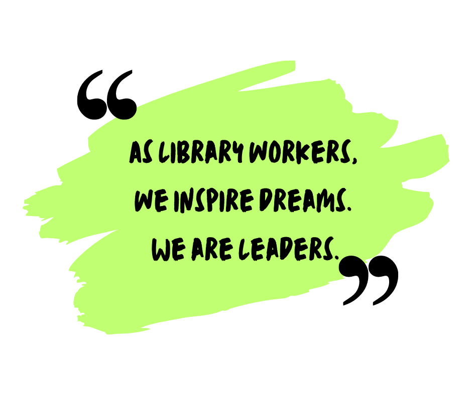 As I grow in my own library leadership, I recognize the need for others around us to know this truth. As library workers, we inspire dreams. We thought partner to help others learn more about the world around them and beside them. We encourage folks to take on and take charge of their aspirations. We support people to become what they hope to become.