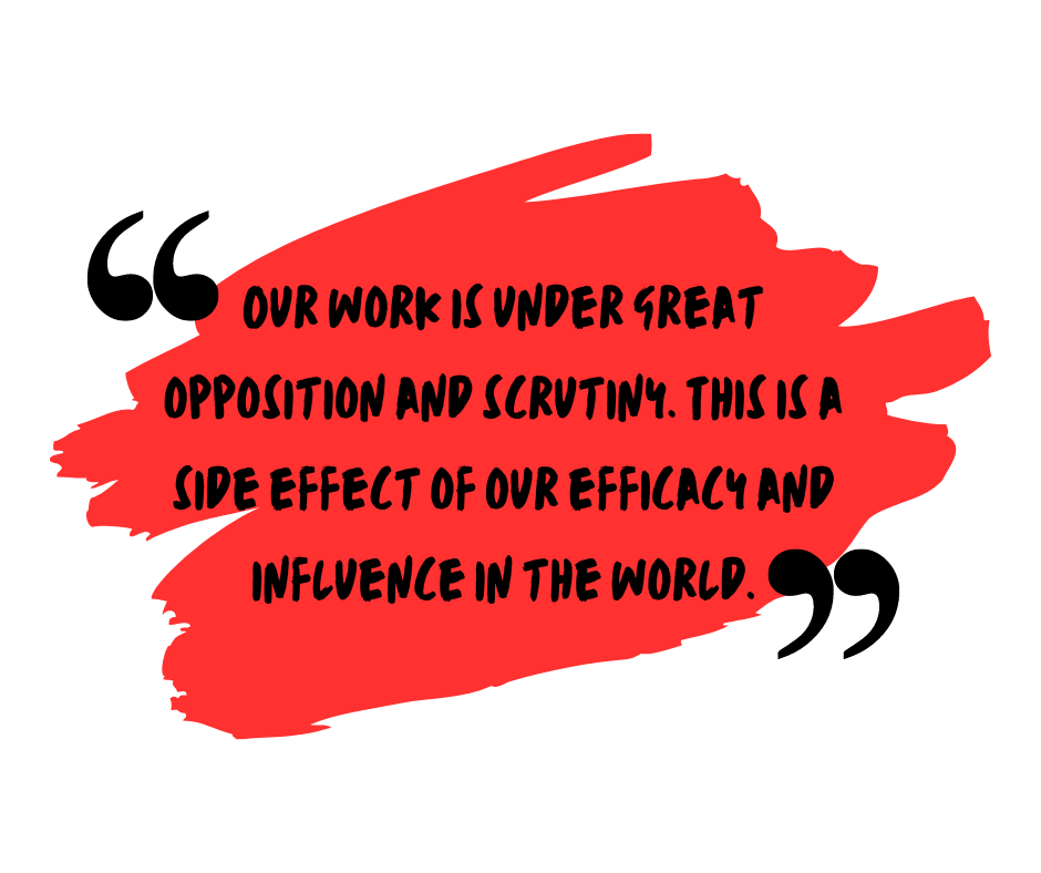 Our work is under great opposition and scrutiny. This is a side effect of our efficacy and influence in the world. If our efforts and impact were not powerful or noteworthy, they wouldn’t be on the radar of those disquieted by their existence.
